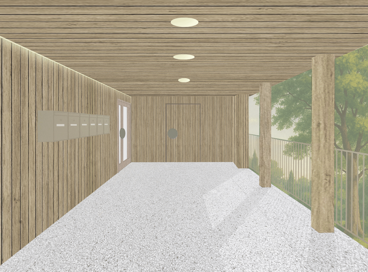 Le programme se compose de six logements traversants, optimisés pour favoriser les apports solaires et les vues dégagées. La distribution spatiale privilégie une séparation claire entre les espaces servis (séjours, chambres orientés sud/ouest) et les espaces servants (circulations, bains, cuisines). L'entrée principale, située à l'ouest sous un couvert, ménage une transparence visuelle immédiate vers le cœur d'îlot végétalisé.